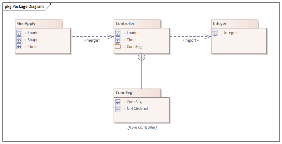 In the example diagram, the «merge» connector indicates that the Controller Package's elements have been imported into GenApply, including Controller's nested and imported contents.