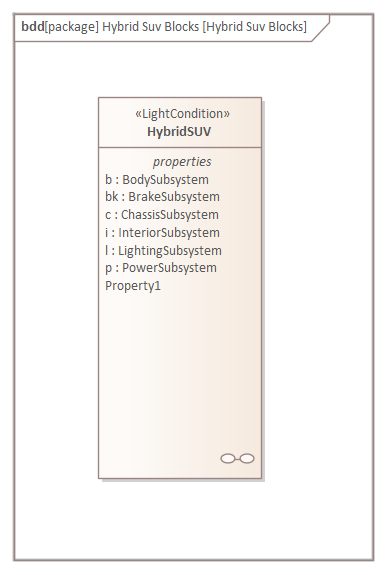 Where the Parts and Properties of a parent Block have already been defined you can display them on the Internal Block Diagram (IBD) with a simple context-menu option on the new IBD.