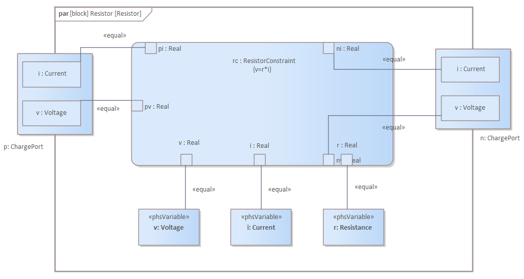 The Block that owns the Parametric diagram is automatically represented by a diagram frame enclosing the Parametric diagram elements. You can: