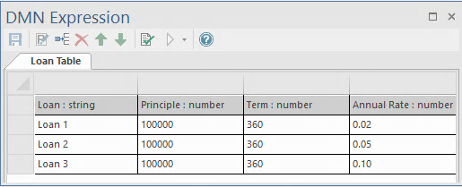 'Loan Table' is a Decision implemented as a Relation with four columns: 'Loan', 'Principle', 'Term' and 'Annual Rate'.