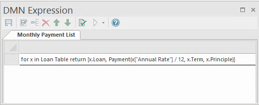 'Monthly Payment List' is a Decision implemented as a Literal Expression with a for loop: