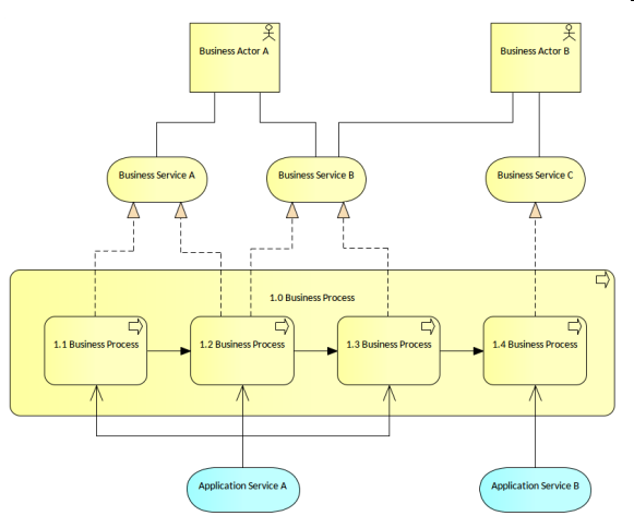 The Service Realization Viewpoint pattern creates elements that show how one or more business services are realized by the underlying processes (and sometimes by application components). Thus, it forms the bridge between the business products viewpoint and the business process view. It provides a “view from the outside” on one or more business processes.