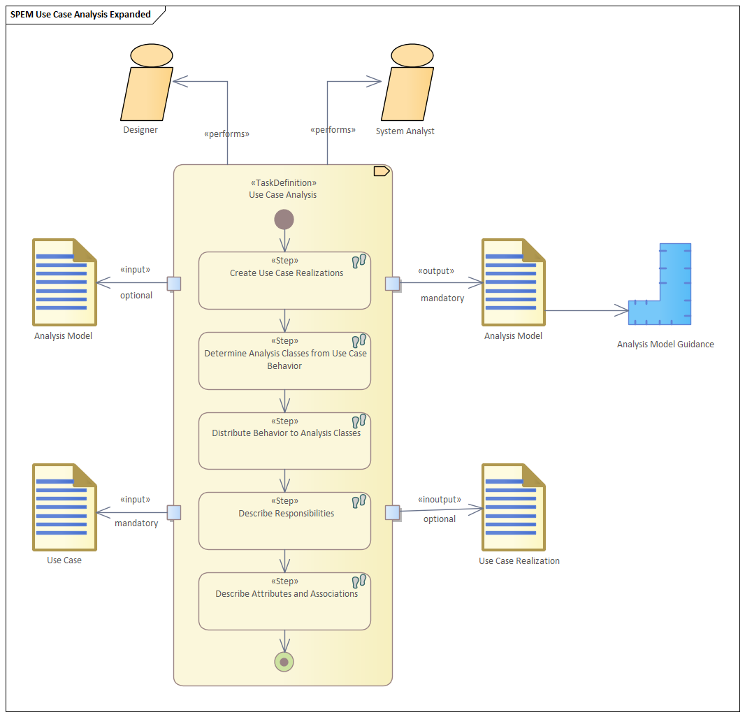 SPEM diagrams allow you to visualize a software or system engineering process and communicate the details of the process to your team members. In this example diagram the steps required for Use Case Analysis have been defined and the inputs and outputs to the Task Definition are shown using Work Product Ports. Guidance for the Analysis Model has also been included to indicate that there is information to assist the performers with this Work Product.