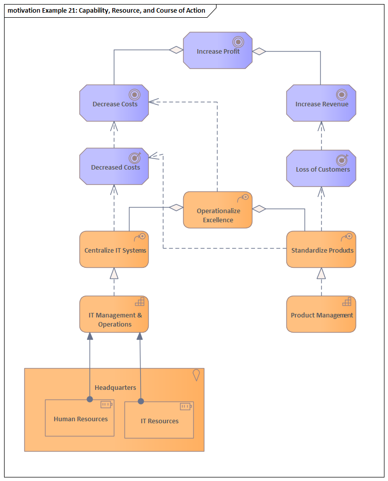 This diagram is concerned with an overarching Goal to Increase Profit that is made up of two other Goals (these could be considered to be Objectives) namely Decrease Costs and Increase Revenue. Then two Outcomes are modeled that influence the delivery of the Goals.  The business architect has modeled two Course of Action elements that influence these Outcomes. The Course of Action elements are Realized by two Capabilities one of which has two Resources Assigned at Headquarters.