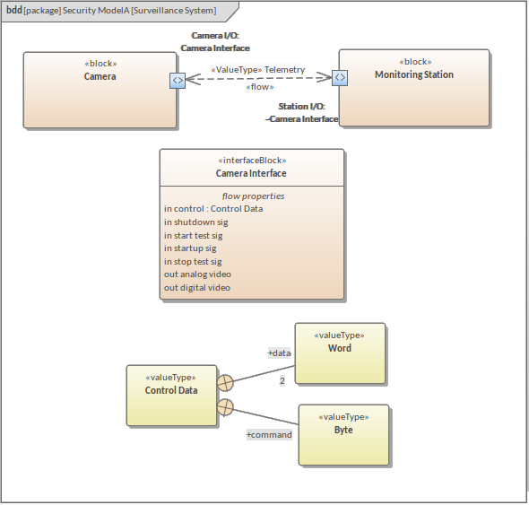 The item identified by a FlowProperty is defined through a series of Value Type elements and Unit and Quantity Type objects that are ultimately derived from your SysML Model Library (see the Creating Model Library Definitions Help topic). On our diagram, this is illustrated by the Control Data, Word and Byte elements that are used to define the 'control' FlowProperty; the definition of each of the other FlowProperties in the diagram would be drawn from a similar arrangement of Value Type elements.