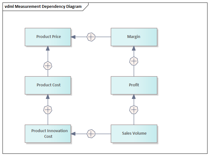 Using the Value Delivery Modeling Language (VDML) facility you can model organizations and the way in which value is exchanged. The models can be used to show the relationship between Capabilities, Activities, Stores, Roles, Value Propositions. In this diagram you will see the use of Measured Characteristics to represent aspects of the cost and profit associated with the development of a new product. The elements are connected by the Measurement relationship, indicating the direction of the measurement.