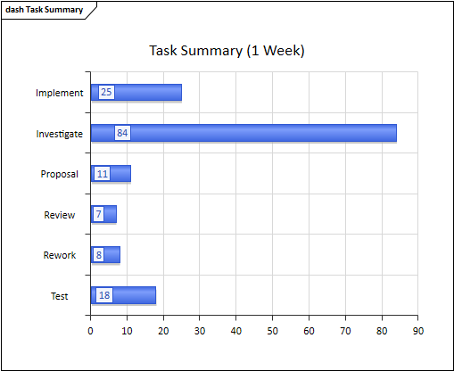 This expressive Bar Chart provides a weekly summary of the number of Work Items completed by phase. The Phases are represented on the vertical axis and the Number of Work Items on the horizontal axis. The Chart can provide information that will help improve the team's performance.