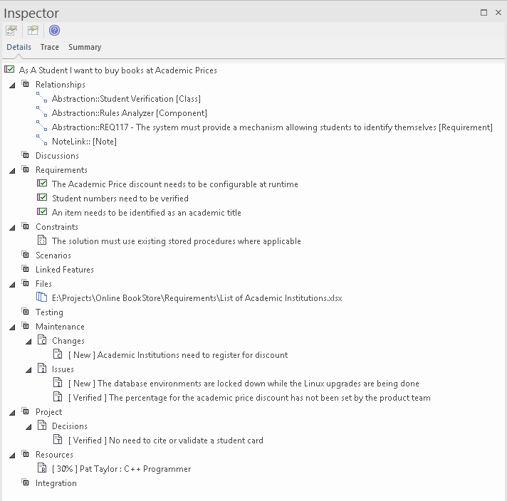 Enterprise Architect also has the 'Details' tab of the Inspector window, which is a convenient tool for viewing all the related information about an element in a single place. The 'Details' tab can be kept open in the Inspector window and items can be selected in a Kanban diagram, List, or Gantt chart, and the Work Item's specific information will be displayed.