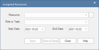The initial details for a resource allocation are entered using the 'Assign Resources' dialog.