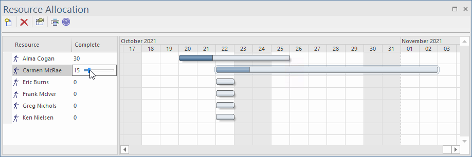 Existing resource allocations can be modified directly on the Gantt chart, by dragging the start or end dates to a new position on the time line, or by dragging the entire task to a new position.