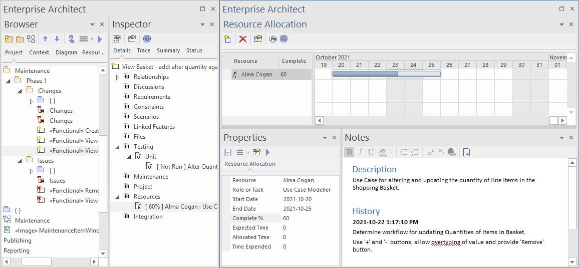If the Properties window is visible, the resource allocation's properties can be updated there, by simply entering new values. Similarly, if the Notes window is visible, entries for Description and History can be updated directly in the Notes window.
