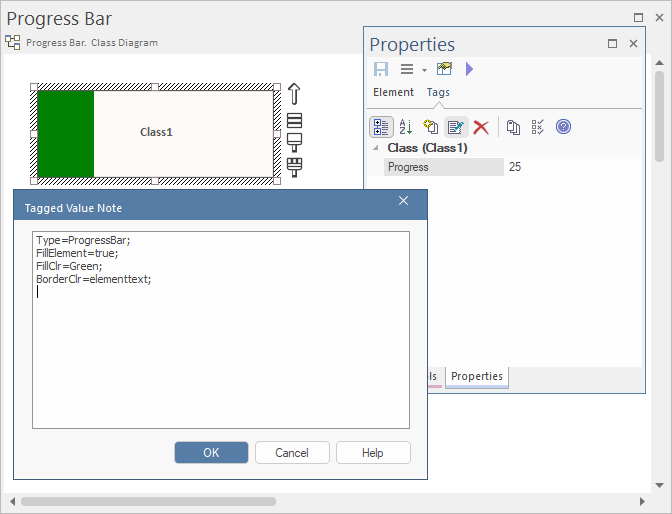 In the Tagged Values Notes, we specify 'Type=ProgressBar;' along with display text and color settings.