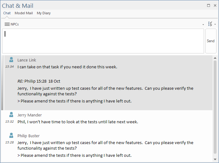 The 'Chat' tab on the Chat & Mail window provides an extremely useful facility of following and participating in quick conversations on a point of interest, with members of a selected user group. The user group can contain a number of users and is defined in User Security, which must be enabled in order for the Chat facility to be available.