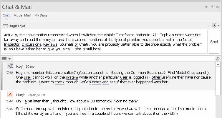 Each initial comment or response is a separate message, listed in date/time order, with the most recent message at the top of the list. The messages are independent of the currently selected model object and the full list displays whenever the user group is selected in the 'Chat' tab. As the messages are independent of any model object, they do not appear in the 'Recently Discussed Elements' report, which is element-based.