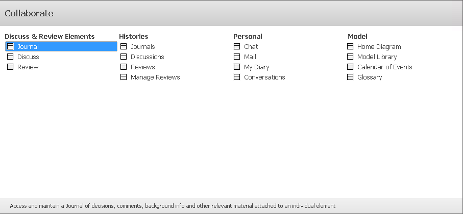 Opens or returns focus to the Discuss & Review window at the 'Journal' tab. The Journal allows you to, for a selected object or diagram, maintain a daily log of ideas, comments, notes, suggestions, to-do lists and other reminders. |