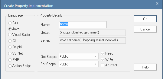 You can configure Enterprise Architect to automatically create properties in the modeled code in any of the programming languages that the system supports. You control property creation from the Properties window for Attributes. Each language has slightly different syntax and generates slightly different results: