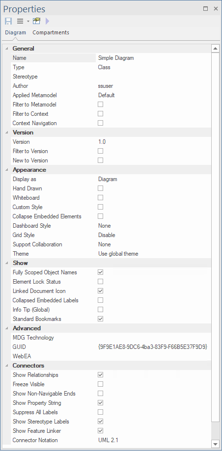 The docked Properties window provides a convenient and immediate way to view and edit properties of modeling objects, including diagrams. When the Properties window is open and you click on an open diagram, the window defines the diagram, displaying the common properties and providing an associated 'Compartments' tab.