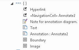 An Annotation Package is a specialized form of Package that is automatically created when a parent Package has one or more diagrams that contain diagrammatic elements - non-model elements that have no purpose outside a diagram. Such elements include Notes, Text, Boundary elements and Navigation Cells. The Package does not have any properties (including not having a name), and is simply a container for those diagrammatic elements, allowing them to be listed in the Browser window and - if necessary - re-used in multiple diagrams. This also protects the elements from being deleted if the diagram that contains them is deleted. The Annotation Package is represented in the Browser Window by a blue Package icon followed by brackets.
