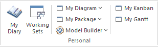 The 'Personal' panel provides options to maintain work area settings that are specific to your login, such as your daily diary, your working sets - groups of windows, diagrams and views to return to as a set in later work sessions - your user default diagram, your default work Package, your Gantt Chart listing your work allocations, and the Kanban diagram you have set as your personal default.