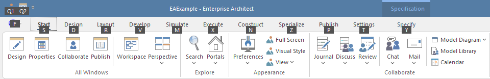 The ribbons expose a wide range of Enterprise Architect features, and the system provides two facilities to help you locate and access the feature you need: