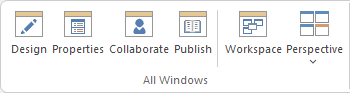 You can use the 'All Windows' panel to access a range of Window Selectors to select and open a window or a workspace. The panel also helps you to define any number of workspace layouts and working sets, saving sets and arrangements of windows that are specific to a role that ultimately increases your productivity as a modeler. The 'Perspective' drop-down helps you to select and set the global Perspective for your model.