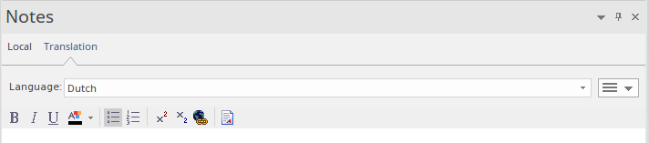 - Perform a manual translation of the notes text displayed in the 'Local' tab, by typing or pasting the translation into the 'Translation' tab; available in all editions of Enterprise Architect