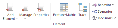 The 'Element' panel provides facilities to manage elements, which are the building blocks of models. Elements can be created and specified with attributes and operations. You can also define scenarios for the activities that the element represents.