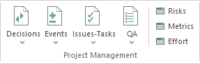 The 'Project Management' panel provides facilities for managing project-level items such as issues, events, tasks and decision, for defining project risks, effort and metrics, and for obtaining an overview of the project status, including Quality Assurance reports and project statistics.