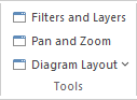 The 'Tools' panel provides a suite of facilities for aligning, viewing or filtering the elements in a diagram. These are tools that assist in working with large or detailed diagrams. Filters and Layers can be used to separate out elements that aren't relevant in a certain context. The Pan and Zoom window helps you change a diagram's magnification, and to quickly traverse a large diagram. The Diagram Layout facility can automatically change and organize the layout of elements in a diagram.