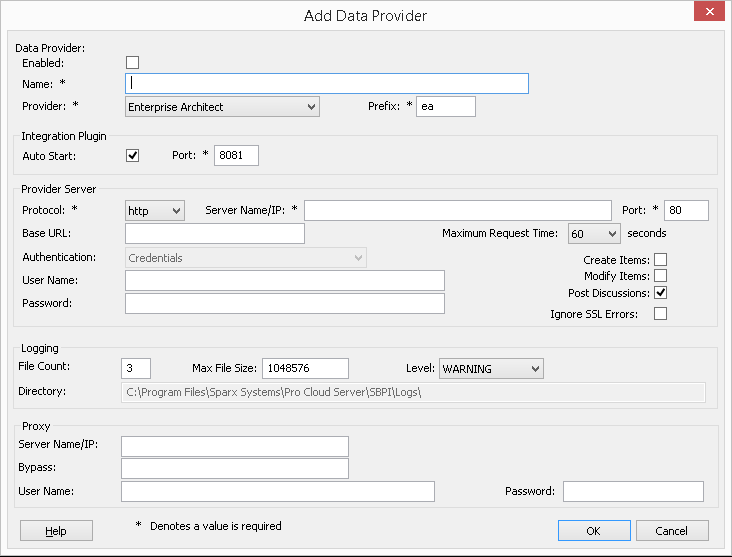 This group of settings defines the details of the external data provider, such as Dropbox, Jira or TFS. The Integration Plug-in will use the defined details to connect to the remote system and retrieve data from it so that it can be sent back to Enterprise Architect. The combination of 'Protocol', 'Server Name 'and 'Port' must be resolvable by the server hosting the Integration Plug-in, which in the simplest case is the Pro Cloud Server.