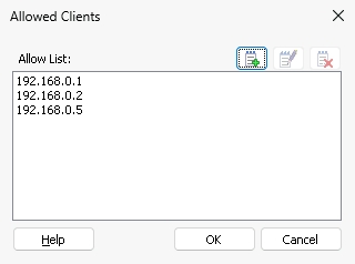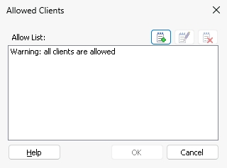 The Allowed Clients screen displays when you click on the 'Access Control' button on the Main screen. It allows you to configure the what Enterprise Architect clients are authorized to communicate with the Pro Cloud Server. By default all clients are authorized, however if your environment requires a higher level of security then it is possible to limit exactly what clients can access the Pro Cloud Server.