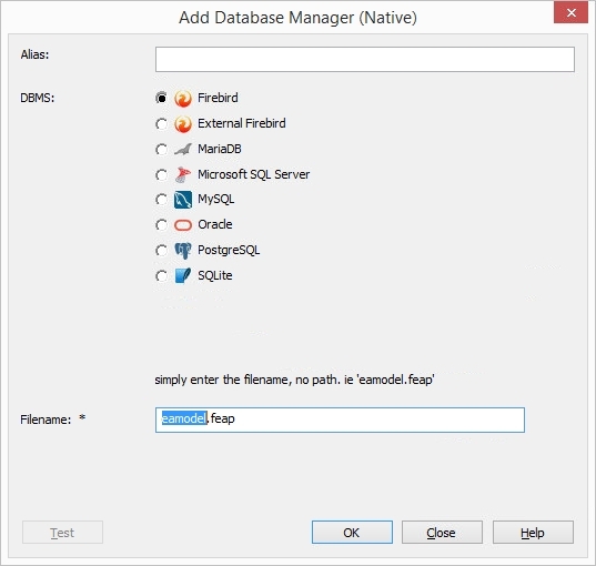 The 'Add Database Manager (Native)' dialog helps you to define a new database manager to an existing server based repository. It is the simplest way, and the recommended method, to set up a connection to repositories in: