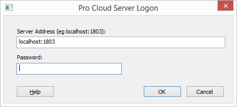 The Server Address format is: <ServerURI>:<Port> The server URI can be ‘localhost’, an IP address, a DNS name or a machine name; for example, MyCloudServer. If you are working on the machine with Pro Cloud Server installed then 'localhost' will be sufficient. Note: from PCS v5.0 the default Port was changed to 1803, in earlier versions it is was 803. |