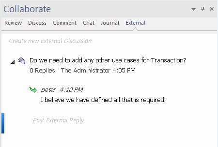 Select an external item from the list to view and participate in its discussions in the 'External' tab of the Discuss & Review window. The 'External' tab resembles the 'Discuss' tab and behaves in the same way.