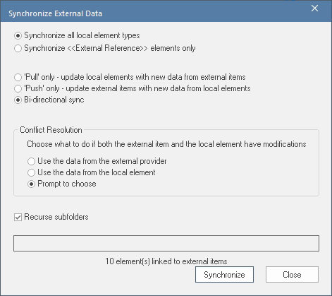 - Choose to synchronize all local elements or to only synchronize elements with the <<External Reference>> stereotypes