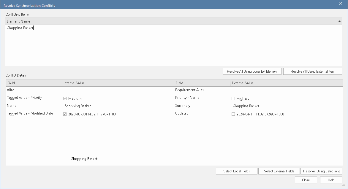 - If selecting 'bi-directional sync' then there is another option to choose what to do in the case that both sides have been updated: either let the external provider override changes, or let EA override the external changes, or open a conflict resolution window to allow choosing individual fields for either side
