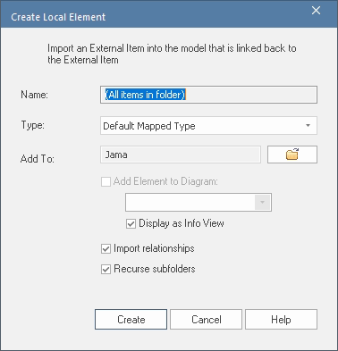 - Optionally select 'Import Relationships' to also import any item relationships as connectors linked to the new element. Note that this is only available for some external data providers. Note that if the other end of the relationship is not linked to an element in Enterprise Architect then no connector will be added.