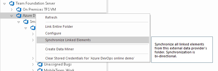 - Either right-click on an external provider in the tree hierarchy and select Synchronize Linked Elements, or click on the 'Hamburger' icon in the toolbar, and select the 'Synchronize Local Linked Elements' option.