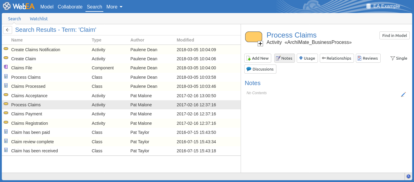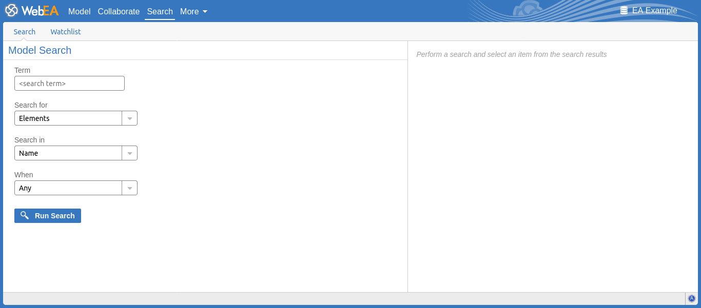 WebEA provides a facility that enables you to search through the model for a specific item or group of items that have certain characteristics. This can help you to quickly locate objects of importance, such as elements you have created yourself (if you have the access privileges to do so).