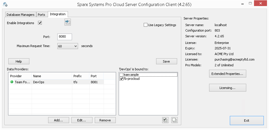 On the 'Integration' tab of the Pro Cloud Server Configuration Client window, you will now see: