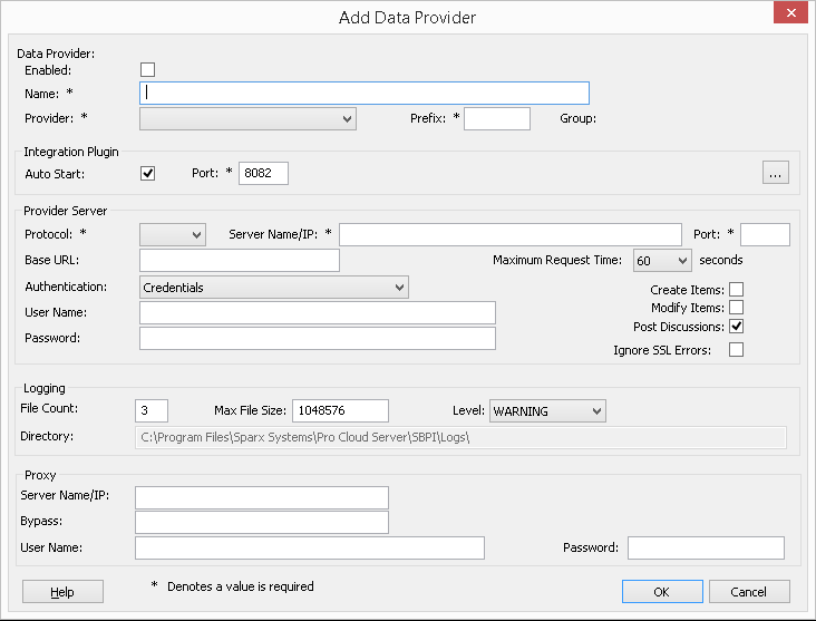 Note, the Protocol, Server, Port and Base URL fields are concatenated to make a web address; that is: <protocol>://<server>:<port>/baseURL (baseURL included if the field is not blank). - You can leave other fields blank or set to their default values. Click on the to complete the configuration. This returns you to the 'Integration' tab of the Pro Cloud Server Configuration Client window.