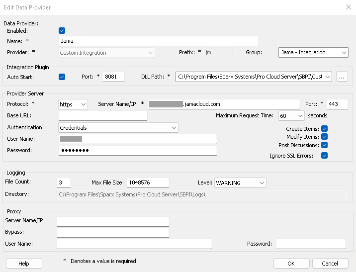 - If your access to Jama uses a Proxy server enter the relevant details in the Proxy section: