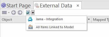 When you tested the communication between Enterprise Architect and Jama, on the External Data window, you used the breadcrumb trail to view lists of work items (e.g. Tasks). If this list is too long, you can click on the 'Hamburger' icon in the window toolbar.
