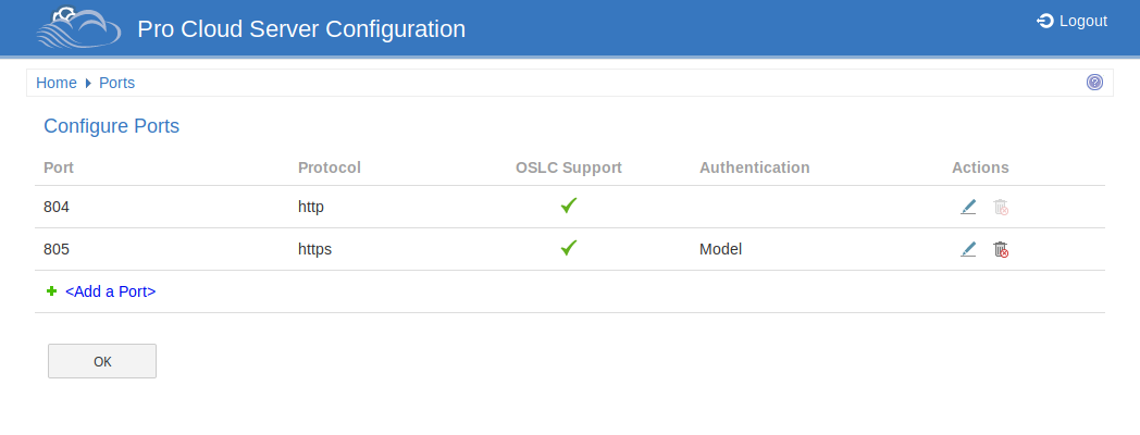 The 'Ports' page allows you to configure Ports that can be used for communication with the Pro Cloud Server. A Port must be configured to allow access to Cloud Models (via Enterprise Architect or WebEA).