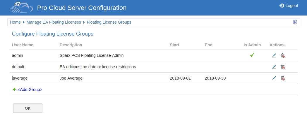 The Floating License Groups configuration can be accessed via the on the 'Manage EA Floating Licenses' page.