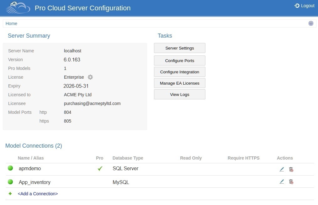 The Pro Cloud Server Configuration 'Home' page has three sections - 'Server Summary', 'Tasks' and 'Model Connections'.