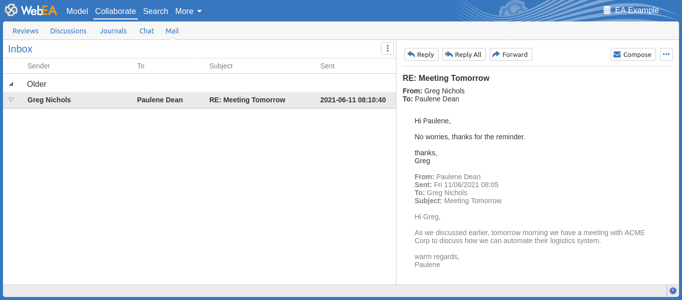 Enterprise Architect's internal Model Mail system can be accessed within WebEA, allowing you to view and send messages from your web browser.