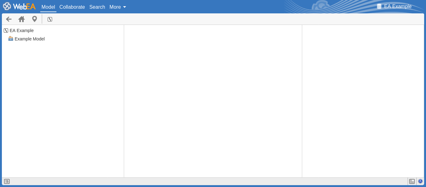 This image shows the WebEA screen after loading the example model, when no default diagram has been configured.