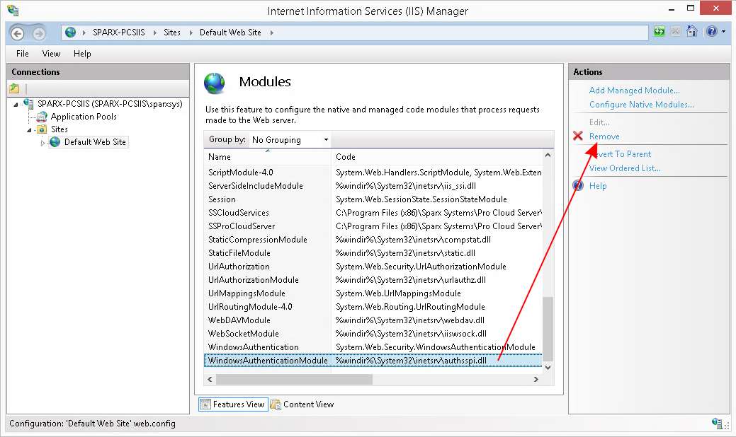 Select the 'WindowsAuthenticationModule', then click the 'Remove' action.