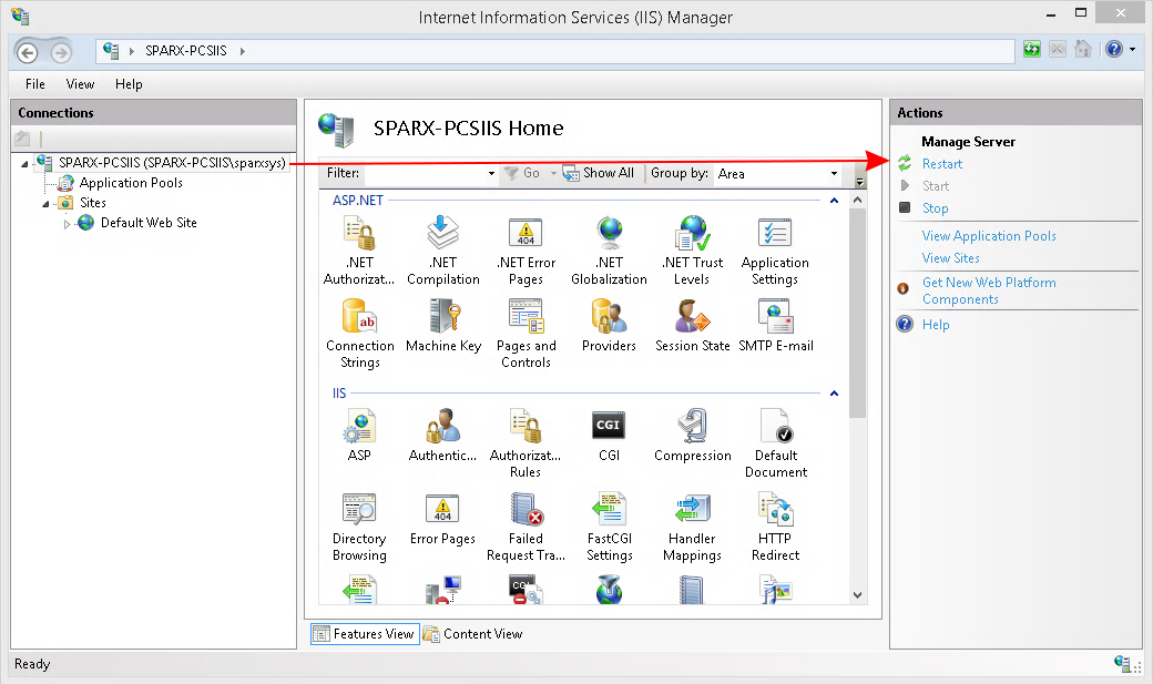 Now select the IIS server/home, then click the 'Restart' action.